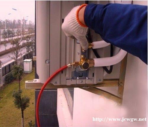 3、如室外机在人手能摸到的地方,可在开机十几分钟后用手摸。室外机有两个铜阀门,一个接粗铜管,一个接细铜管。用手摸两阀门应有温差;粗的应比细的温度低些,摸着比较凉为正常(在温度高时也应有冷凝水),再摸室外机的热风是不是热呼呼的,如果不大热可能缺氟。